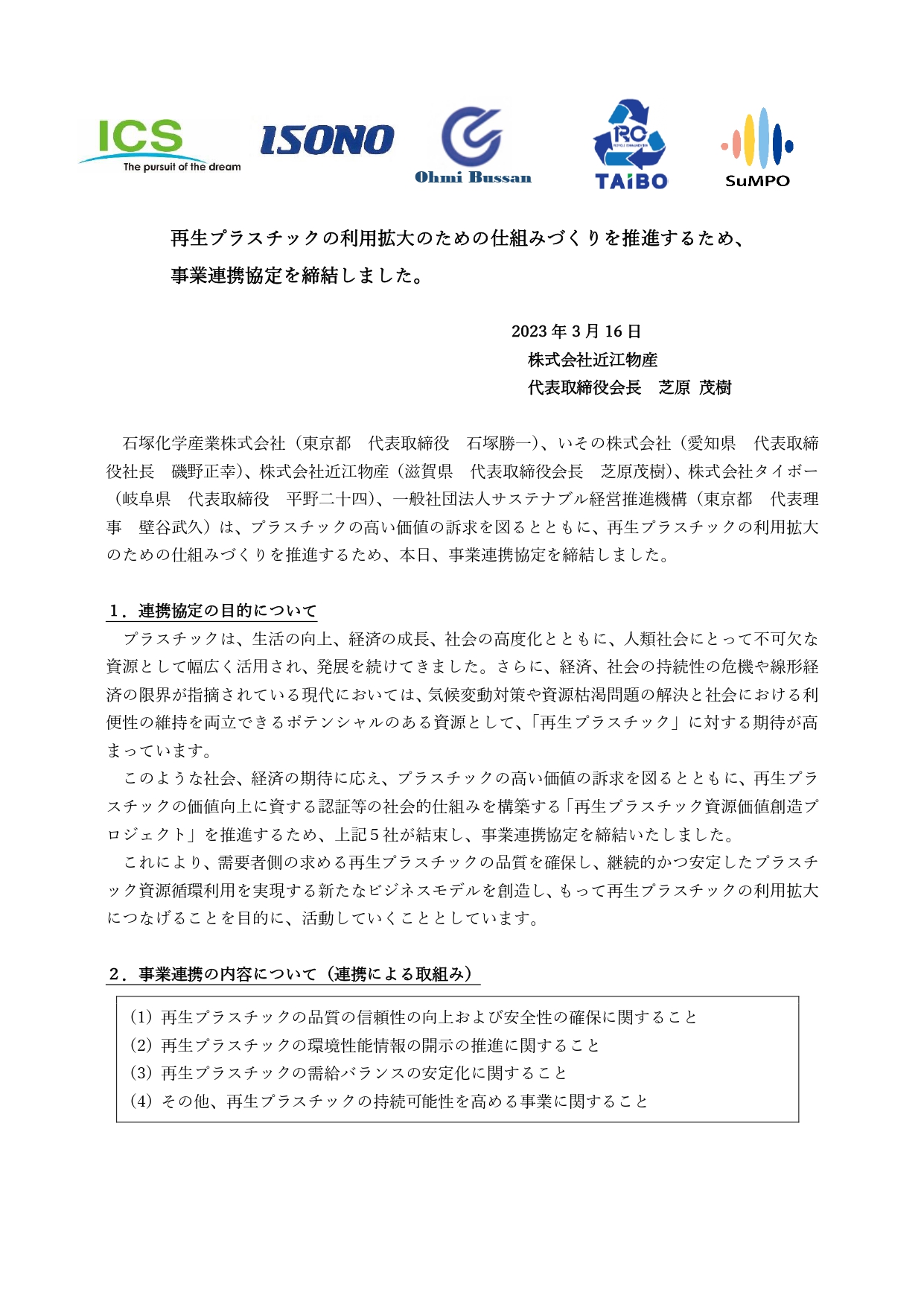 弊社は2023年3月16日に再生プラスチックの利用拡大の仕組みづくりを推進するため、事業連携協定を締結しました。https://sumpo.or.jp/news/recycle_plastic_agreement_20230316.html